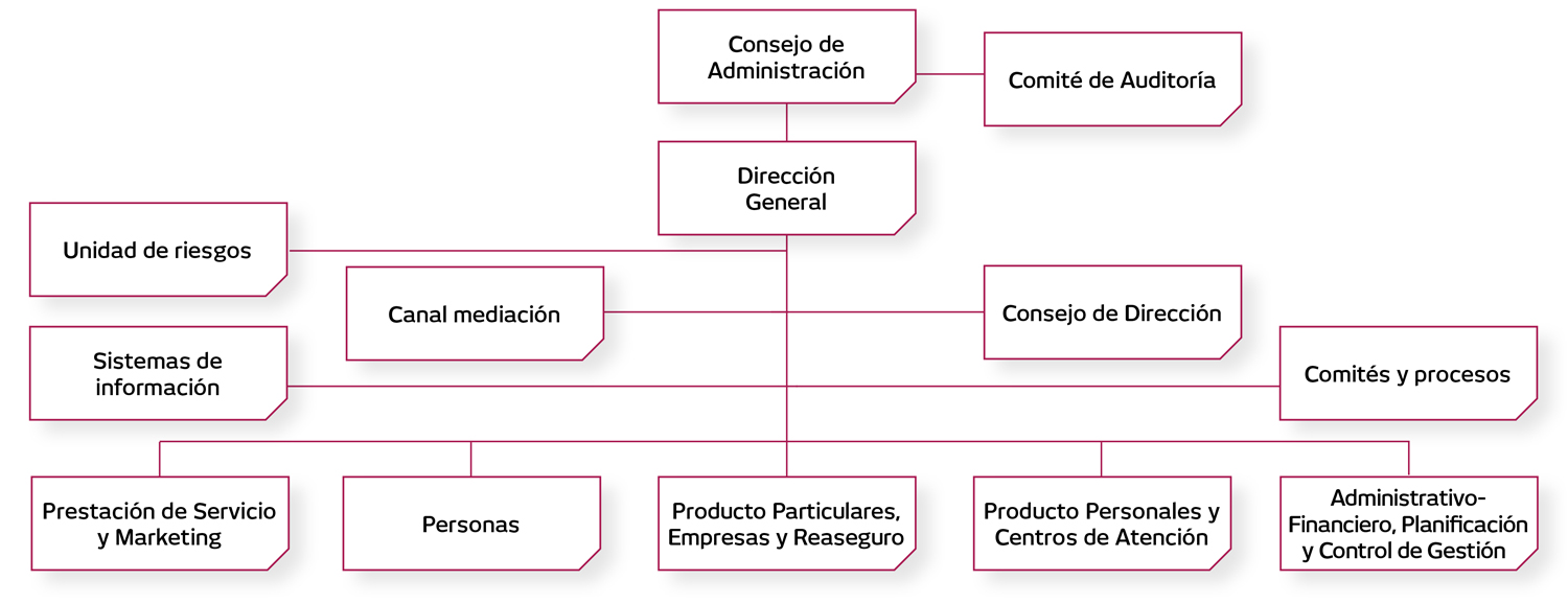Seguros Lagun Aro, con sede social en Bilbao, está conformada por el Consejo de Administración, Consejo de Dirección y Áreas Funcionales que dependen de Dirección General.